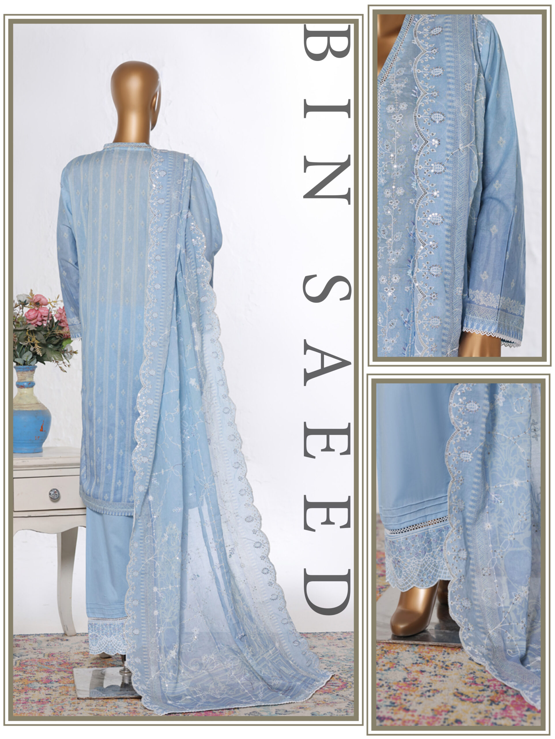 Elevate your summer wardrobe with this elegant Bin Saeed 3PC Lawn Suit, designed for women who love grace and sophistication. This outfit features a beautifully crafted Chikankari embroidered shirt, paired with a stylish trouser with delicate embroidery detailing on the hem, and a stunning cutwork embroidered dupatta that completes the look with timeless charm.