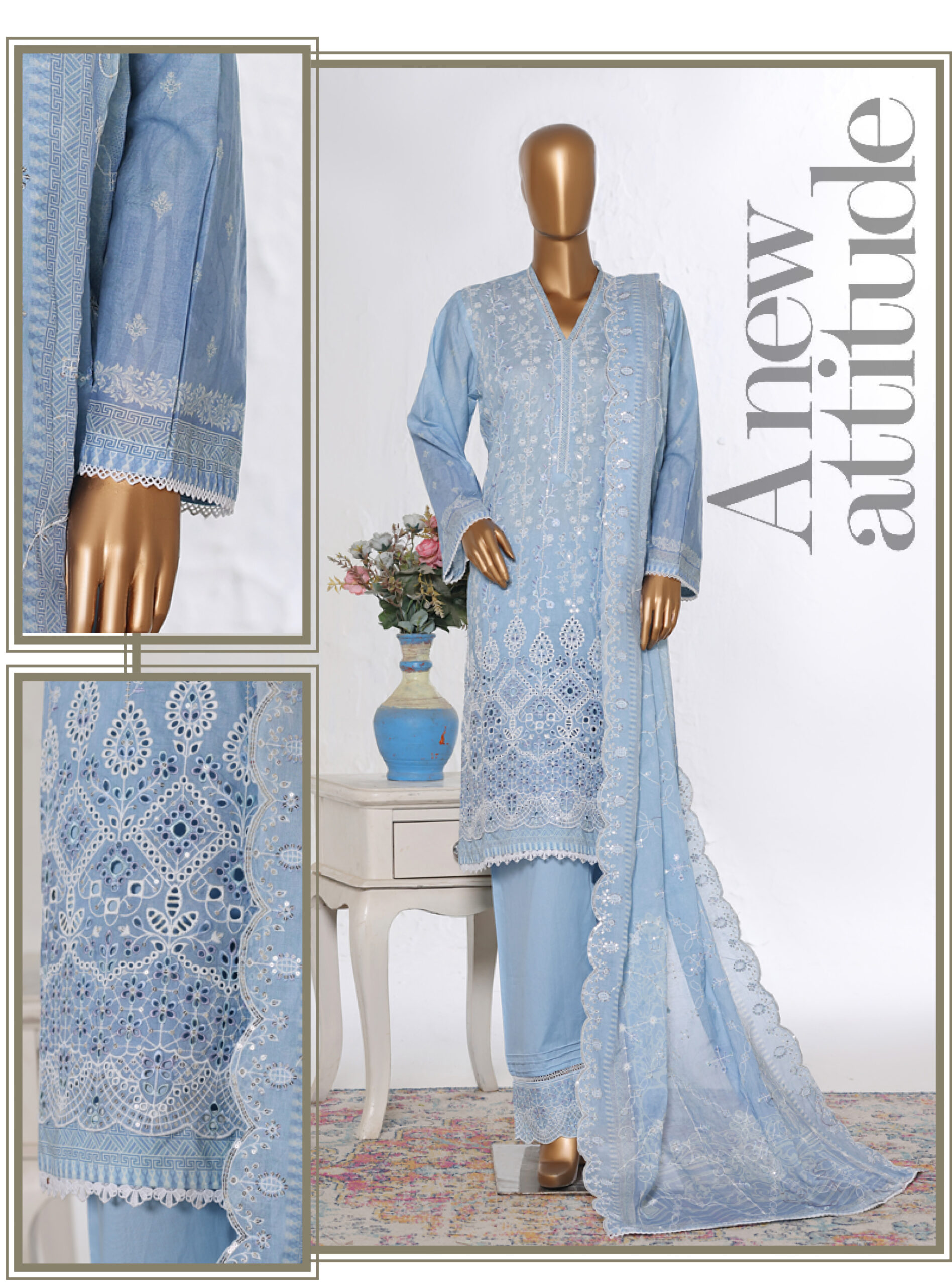 Made from premium quality breathable lawn fabric, this ensemble ensures comfort throughout the day while maintaining a luxurious appearance. The intricate embroidery and fine craftsmanship make it perfect for casual gatherings, festive events, and semi-formal occasions.