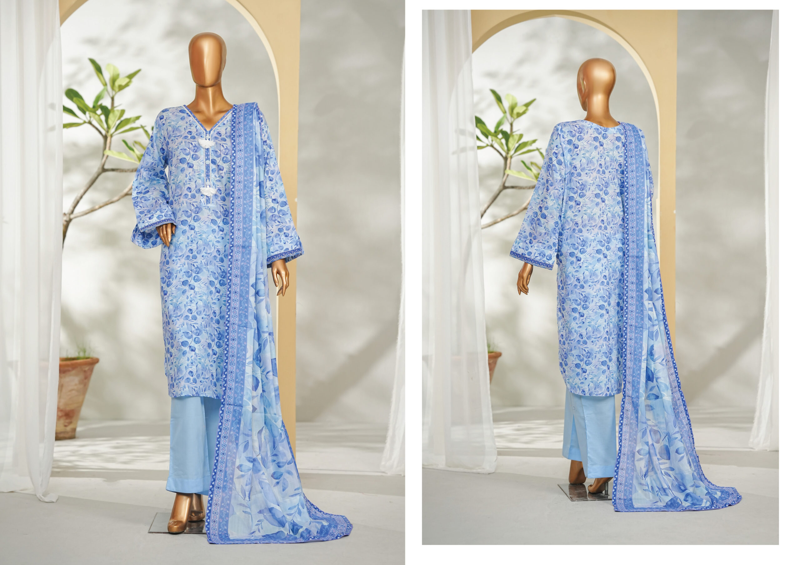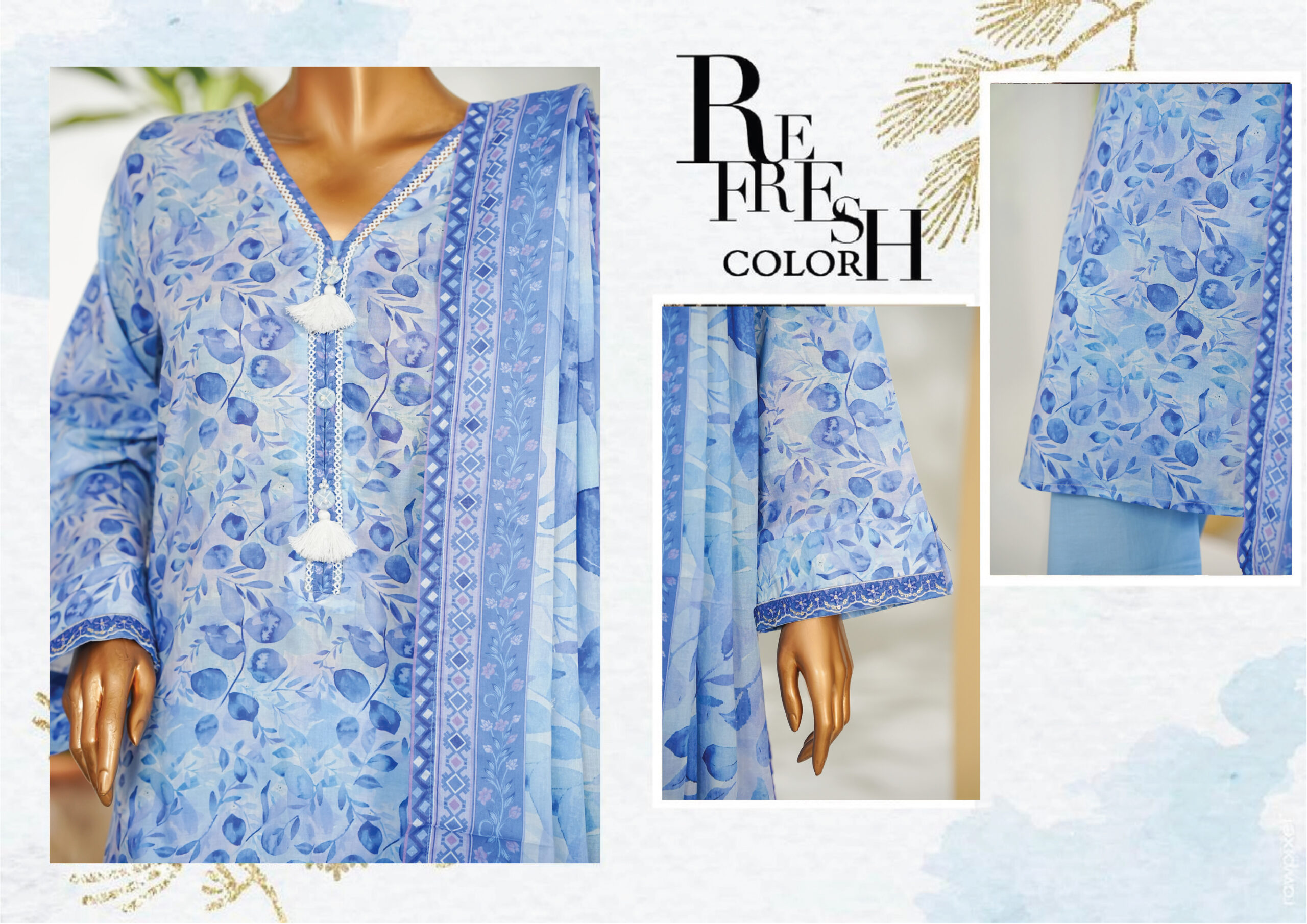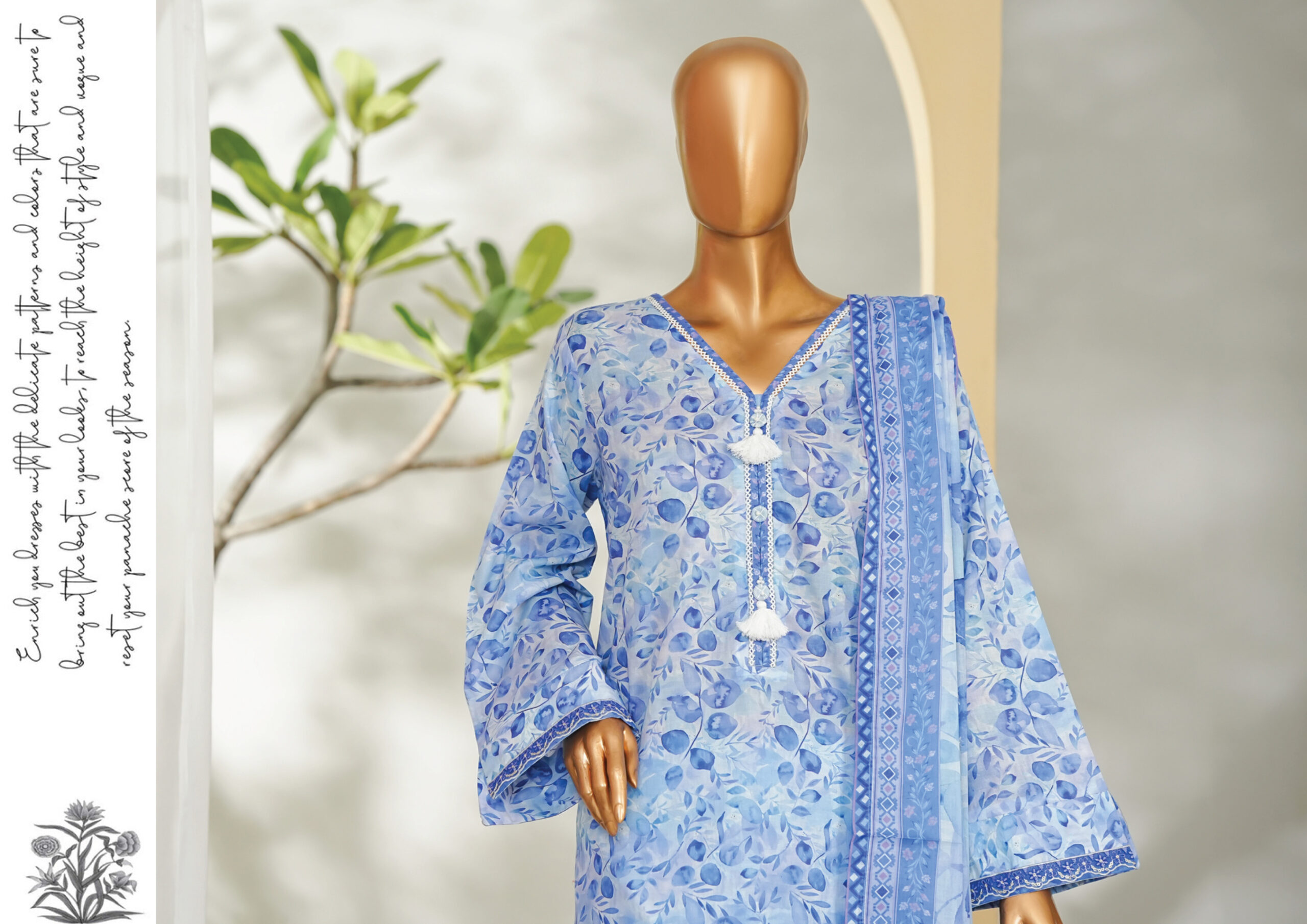 The beautifully designed printed shirt with tassel stylish cuff embroidery slevees features vibrant patterns and fine detailing, paired with a matching printed or plain trouser for a graceful look. The coordinating printed dupatta adds a refreshing touch, completing the ensemble with effortless charm.