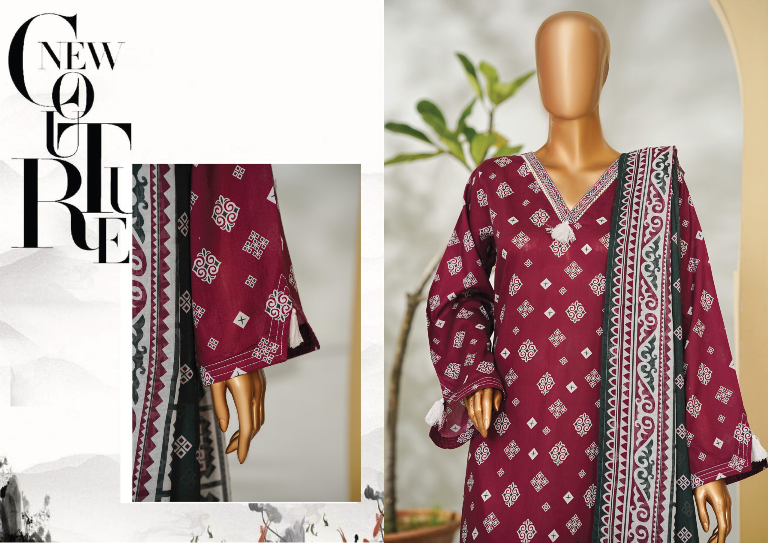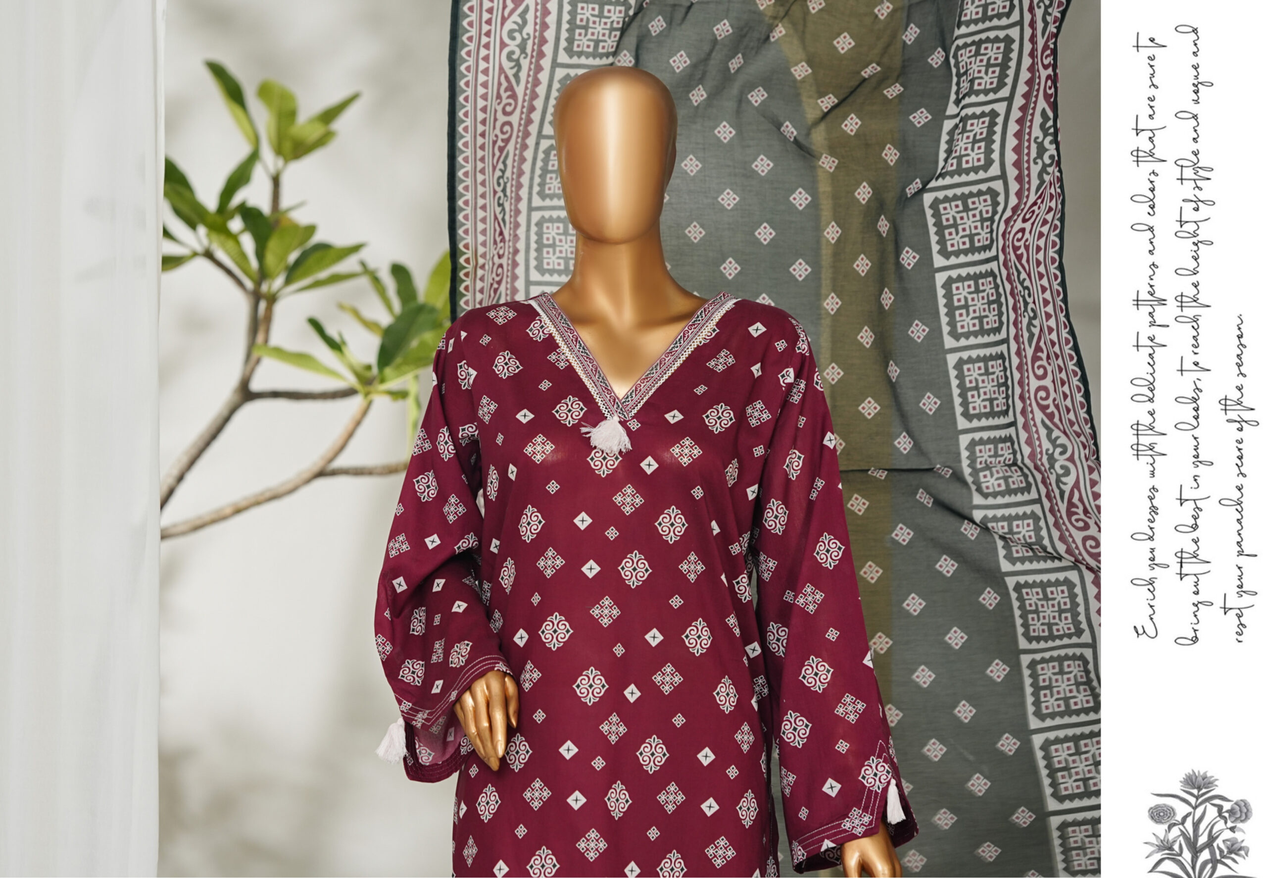 The beautifully designed printed shirt features vibrant patterns and fine detailing, paired with a matching printed trouser for a graceful look. The coordinating printed dupatta adds a refreshing touch, completing the ensemble with effortless charm.